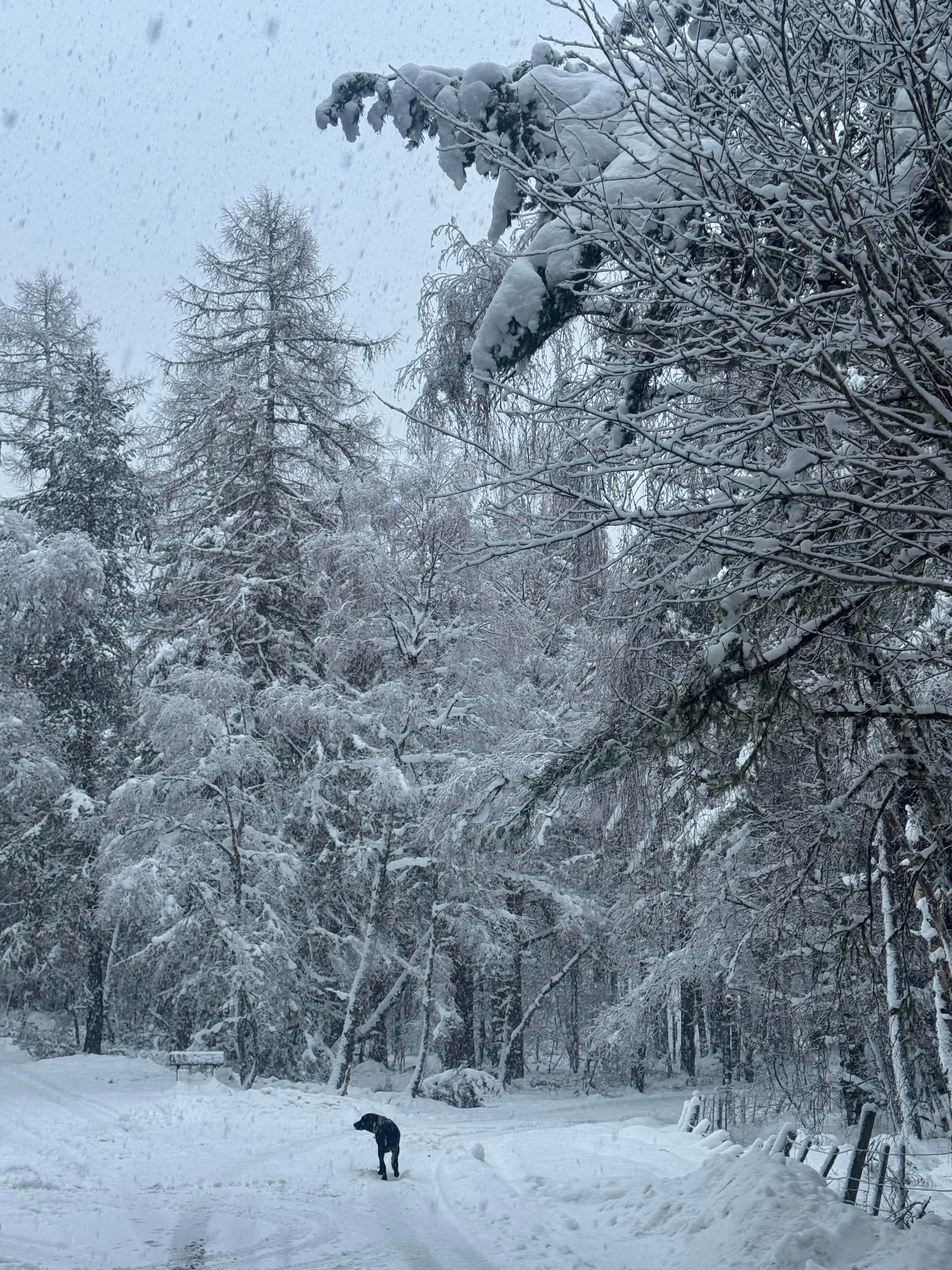 I am in a forest village filled with snow that keeps falling as fast as it melts